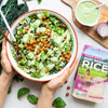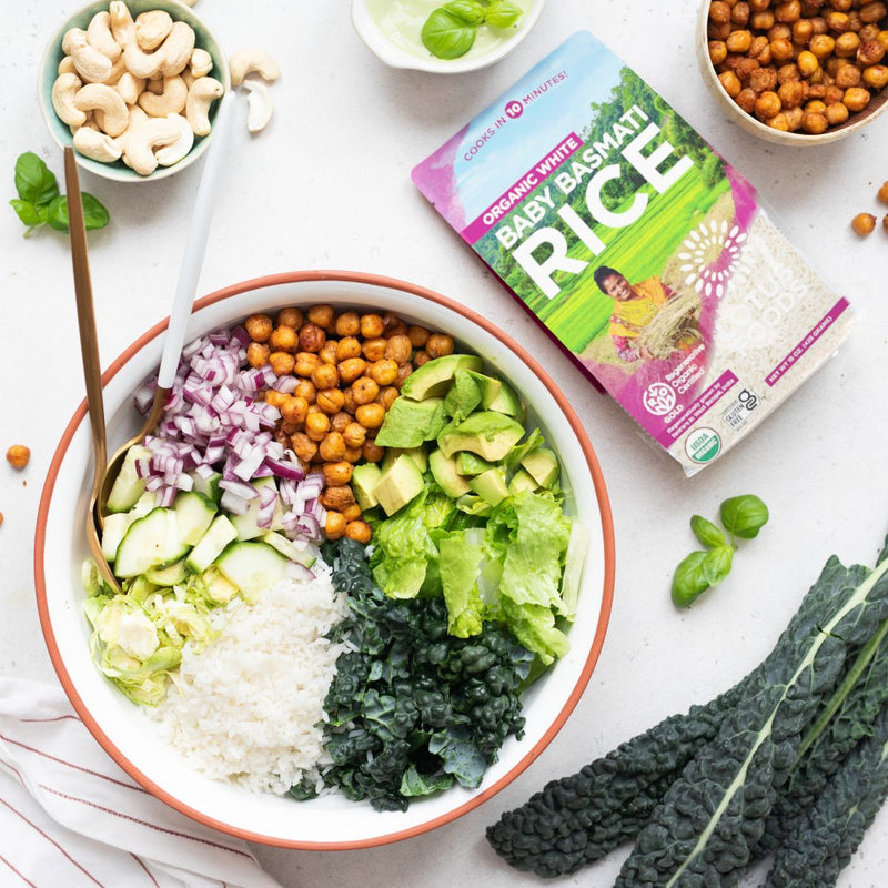 In a large salad bowl, combine rice, romaine, kale, Brussels sprouts, diced cucumber, avocado, red onion, and crispy chickpeas.