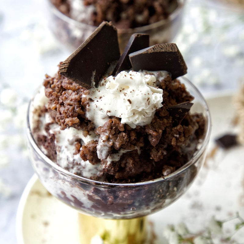 Transfer to a serving dish or divide among individual dishes. Serve warm, at room temperature, or lightly chilled. Top with cream/crème fraiche and sprinkle with chocolate, as preferred.