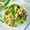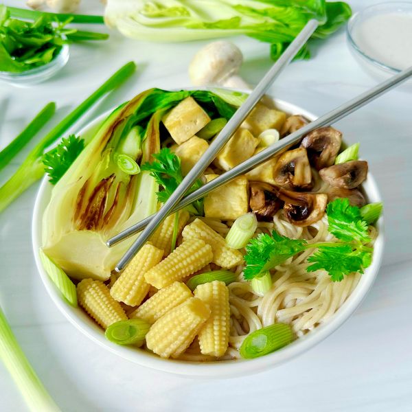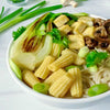 Top with bok choy, tofu, mushrooms, and baby corn, and garnish with green onions and cilantro.