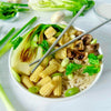 As tofu is frying, heat a pan with a little avocado oil, add your bok choy and mushrooms, and fry for 2-3 mins (bok choy will be seared and slightly wilted, mushrooms will have a slight color). Remove from pan and set aside.