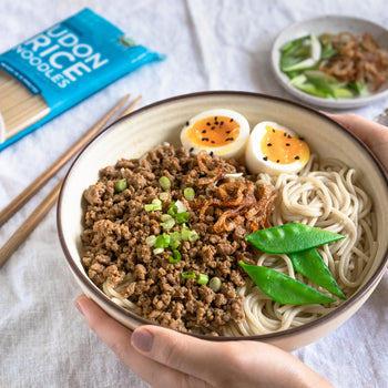 Season noodles with soy sauce, dark soy sauce, brown sugar, and vinegar, then add in minced garlic, grated ginger, chili flakes, and green onions.