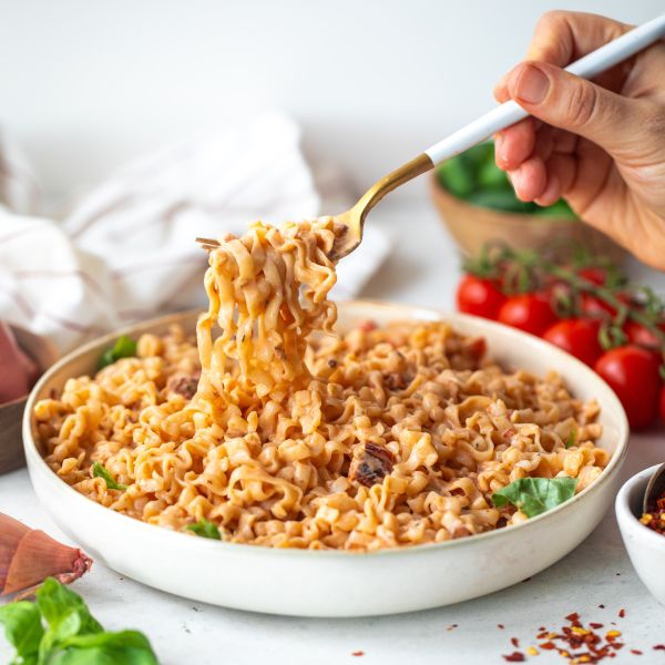 While the sauce simmers, cook noodles according to directions on package, then add to the sauce, tossing gently to coat evenly. Heat through for 1-2 mins.