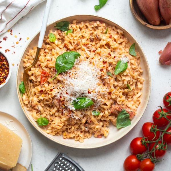 Serve immediately, garnished with fresh basil leaves and extra parmesan. Leftover sauce stays good in the fridge for 2-3 days in an airtight container.