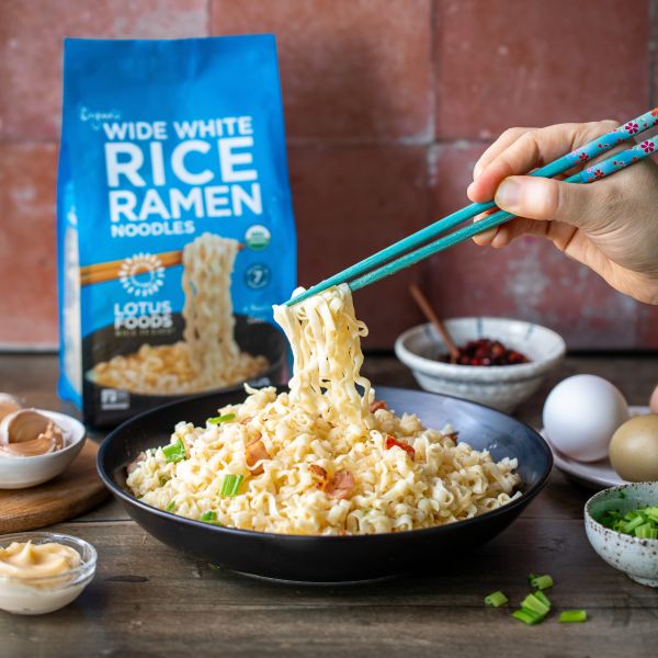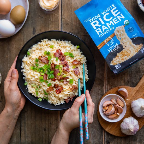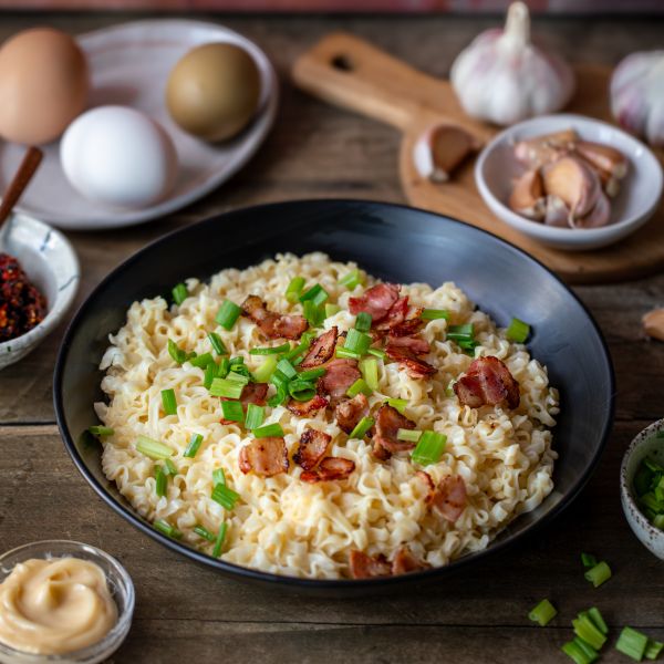 Add hot noodles to the bowl and toss immediately so the heat thickens the sauce without scrambling the yolk. Add more broth or cooking water to loosen the sauce if needed.