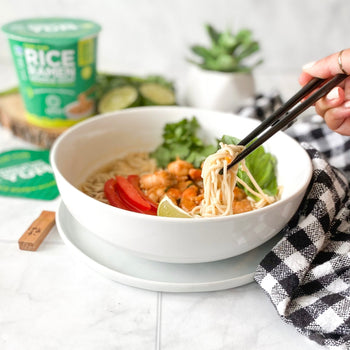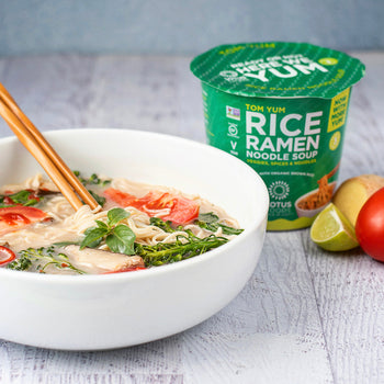 Divide noodles between two bowls. Add the bok choy, lotus roots, tofu or tempeh, and lime wedges. Sprinkle noodles with more peanuts.