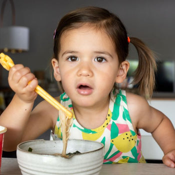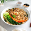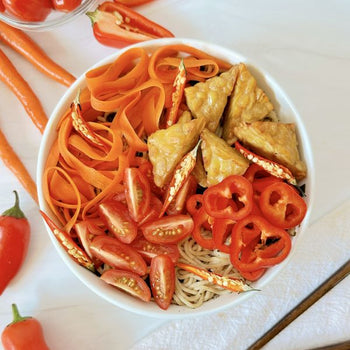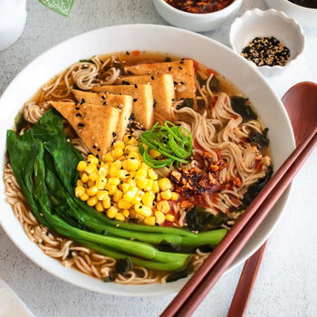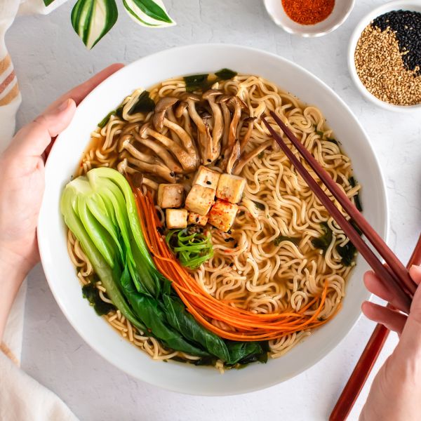 Top ramen soup with prepared vegetables and tofu, garnish with green onions, sesame seeds, and shichimi togarashi.
