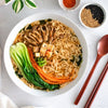 Heat vegetable oil in a pan over a medium heat, then add mushrooms and tofu. Pan-sear until light golden brown.