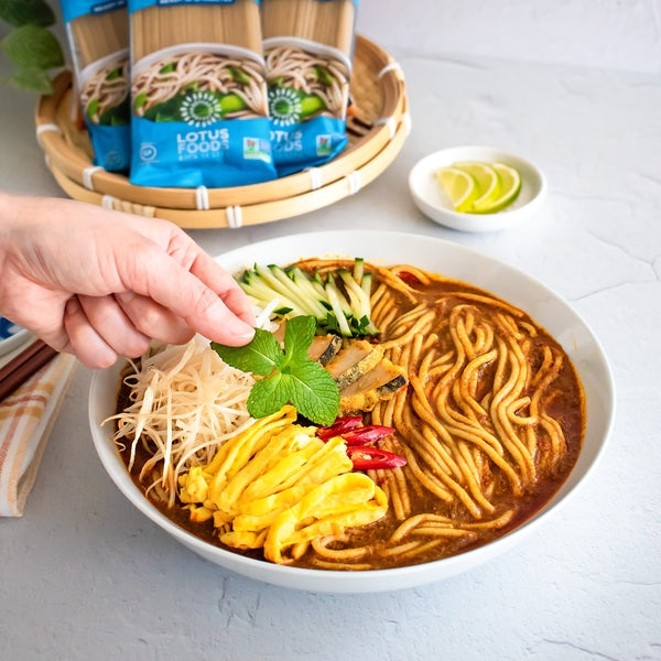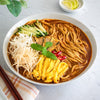 Prepare noodles according to directions on package then place into individual serving bowls and cover with laksa broth.