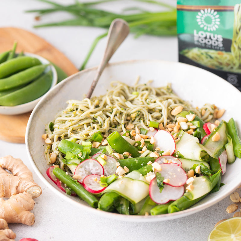 Place noodles in a large bowl, add pesto and toss to coat, then divide into bowls and top with salad. Sprinkle with roasted peanuts and spring onions.