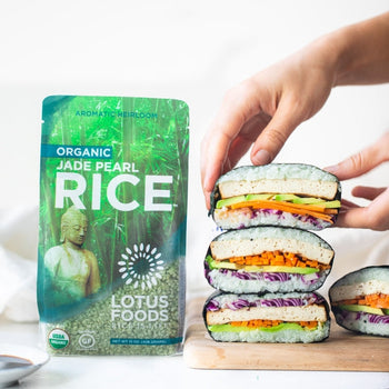 Scoop up ⅓ cup of the rice mixture and gently flatten against your hand. Add the prepared vegan omelet. Shape rice into a ball while encasing the omelet. Tip: use food-safe gloves.