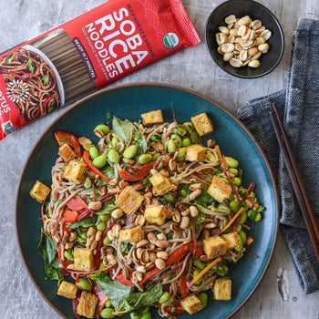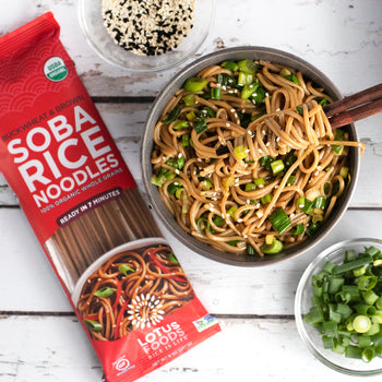 Heat sesame oil in a large pan over medium-high heat and add noodles and rice. Stir to cook for 1-2 mins.