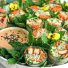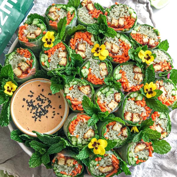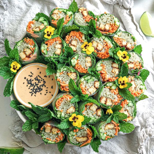 Working on the bottom third of the rice paper, spread some spinach leaves, noodles, a few pieces carrot, cabbage, sliced tempeh or tofu, cucumber, 2 slices bell pepper and herbs. Do not overfill. Use a few pieces of each filling ingredient. Fold up bottom edge to cover, then fold in the sides. Roll tightly.
