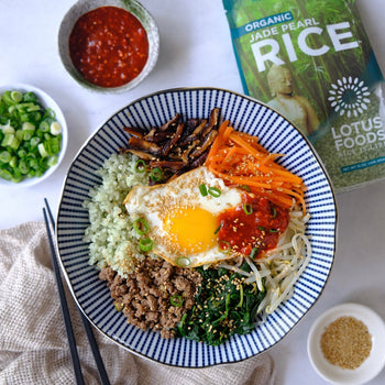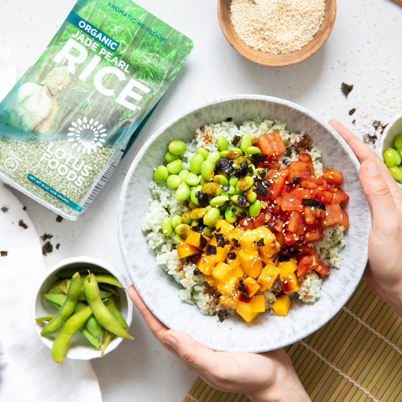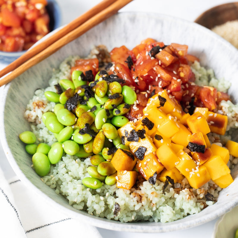 Divide cooked rice between bowls. Top with tomatoes, mango, and edamame. Drizzle with the sweet soy sauce. Top with sesame seeds and nori.