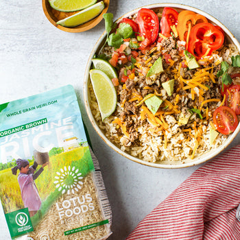 Add rice to large, shallow bowls and top with sweet potatoes, tofu crumble, pickled veggies, and mushrooms.