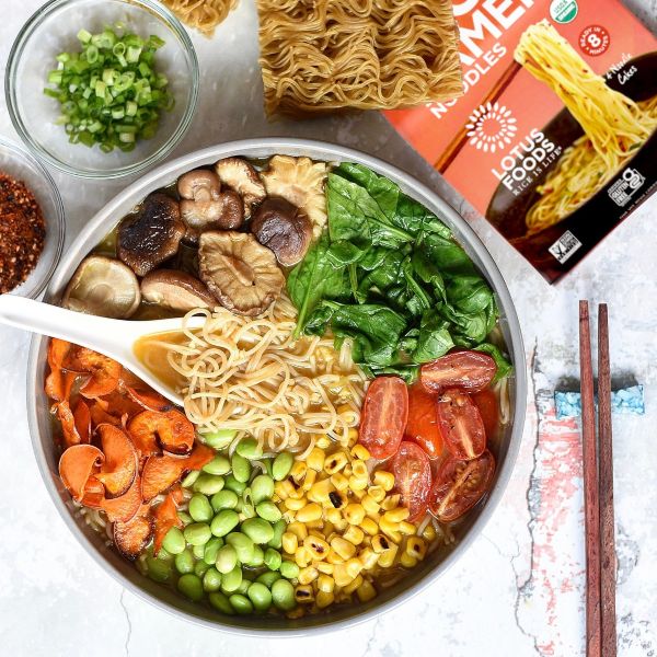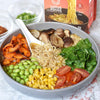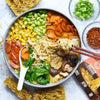 To serve, add a serving of noodles and a handful of baby spinach to each bowl, ladle in the broth (~2-3 ladles per person), then add mushrooms, tomatoes, corn, and edamame. Add sweet potato chips last - they won’t stay crispy for long, but the flavor is amazing. Garnish with scallion greens and togarashi seasoning.