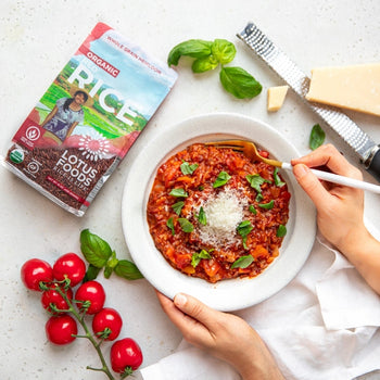 Divide rice between serving bowls and top with chili, avocado, cilantro, jalapeños, and/or lime wedges.