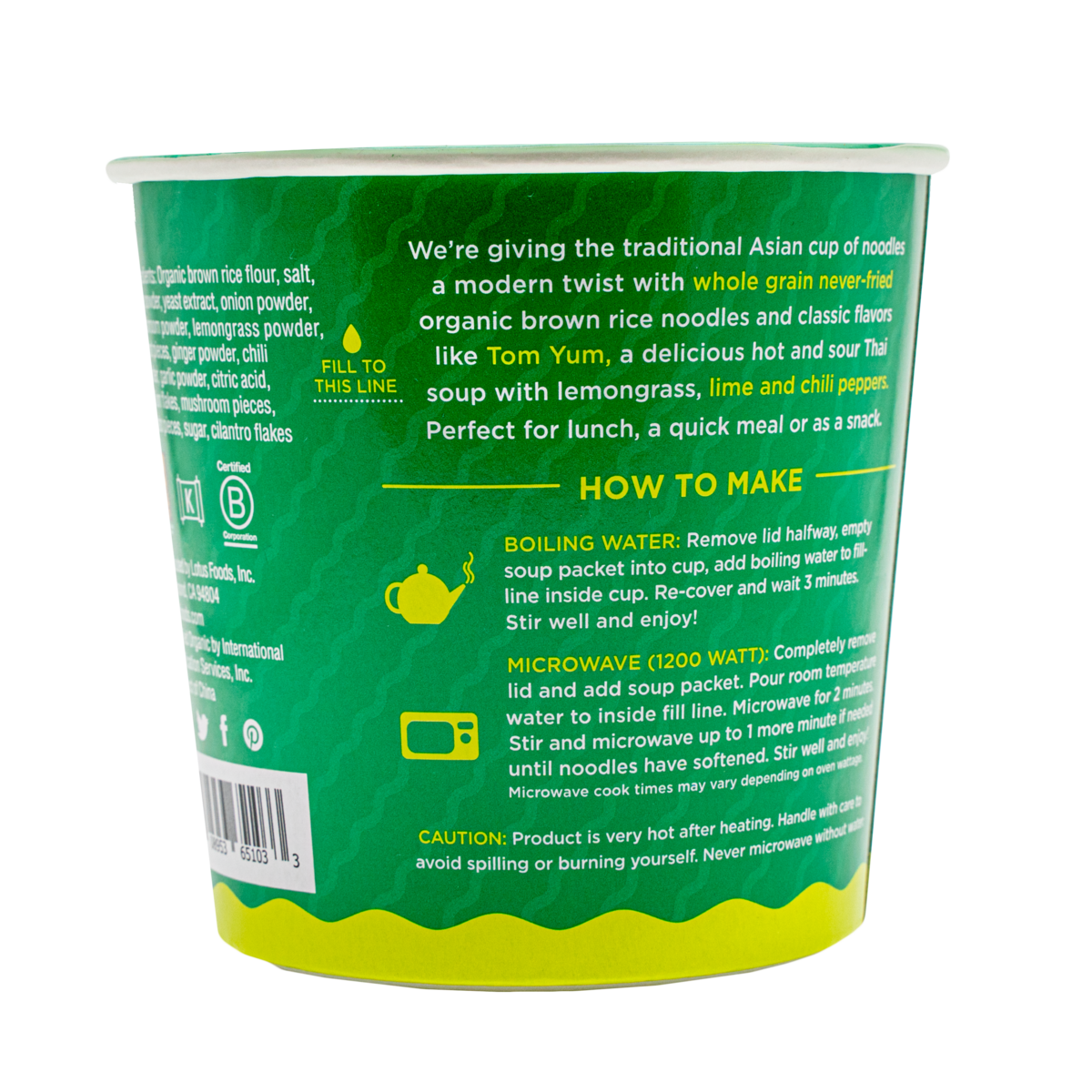 Tom Yum Rice Ramen Noodle Soup Cup is a mouth-watering hot and sour Thai soup with lemongrass, lime and chili peppers and a hint of heat. Our delicious ramen soup cups are a modern twist on the traditional Asian cup of noodles, but with whole grain never-fried organic brown rice noodles.