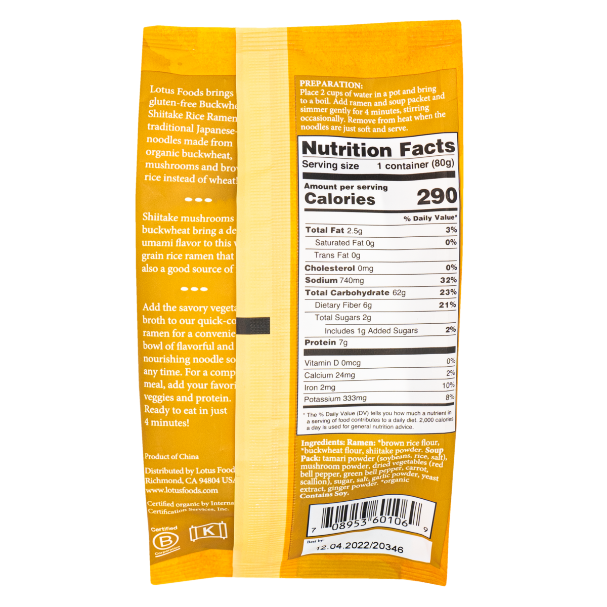 Made with a blend of organic buckwheat, shiitake and whole grain organic rice for an earthy and nutty noodle paired with a savory mushroom broth. Ready to eat in just 4 minutes - perfect for a quick meal on the go! For a complete meal, add in your favorite protein and veggies.