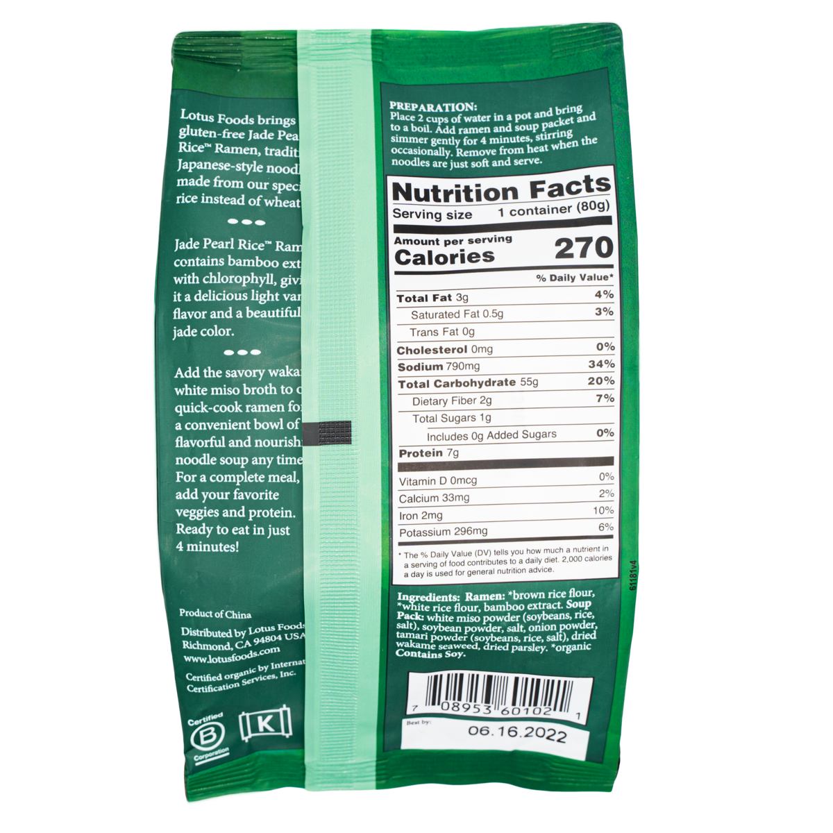Made with our Organic Jade Pearl Rice™ infused with wild-crafted bamboo extract, these beautiful ramen noodles contain chlorophyll and are paired with a white miso and seaweed broth.