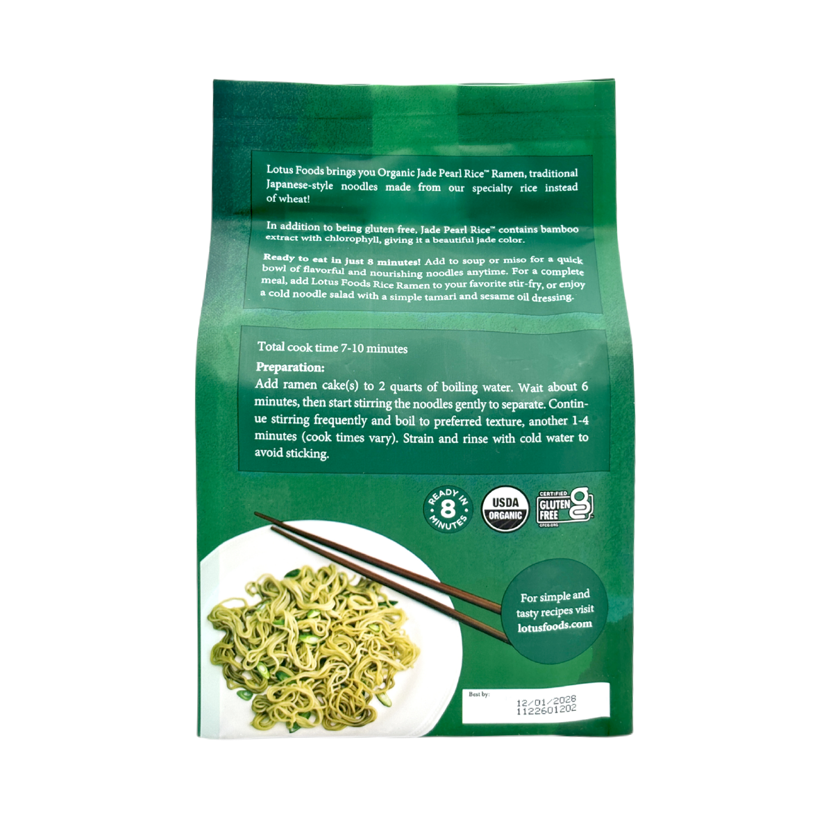 Japanese-style noodles made from our specialty rice instead of wheat. In addition to being gluten free, Jade Pearl Rice™ is infused with chlorophyll-rich, wild-crafted bamboo extract. Our Jade Pearl Rice™ Ramen has a delicious light vanilla taste and enhanced nutritional value. Ready to eat in just 8 minutes! Add to soup or miso for a quick bowl of flavorful and nourishing noodles any time.