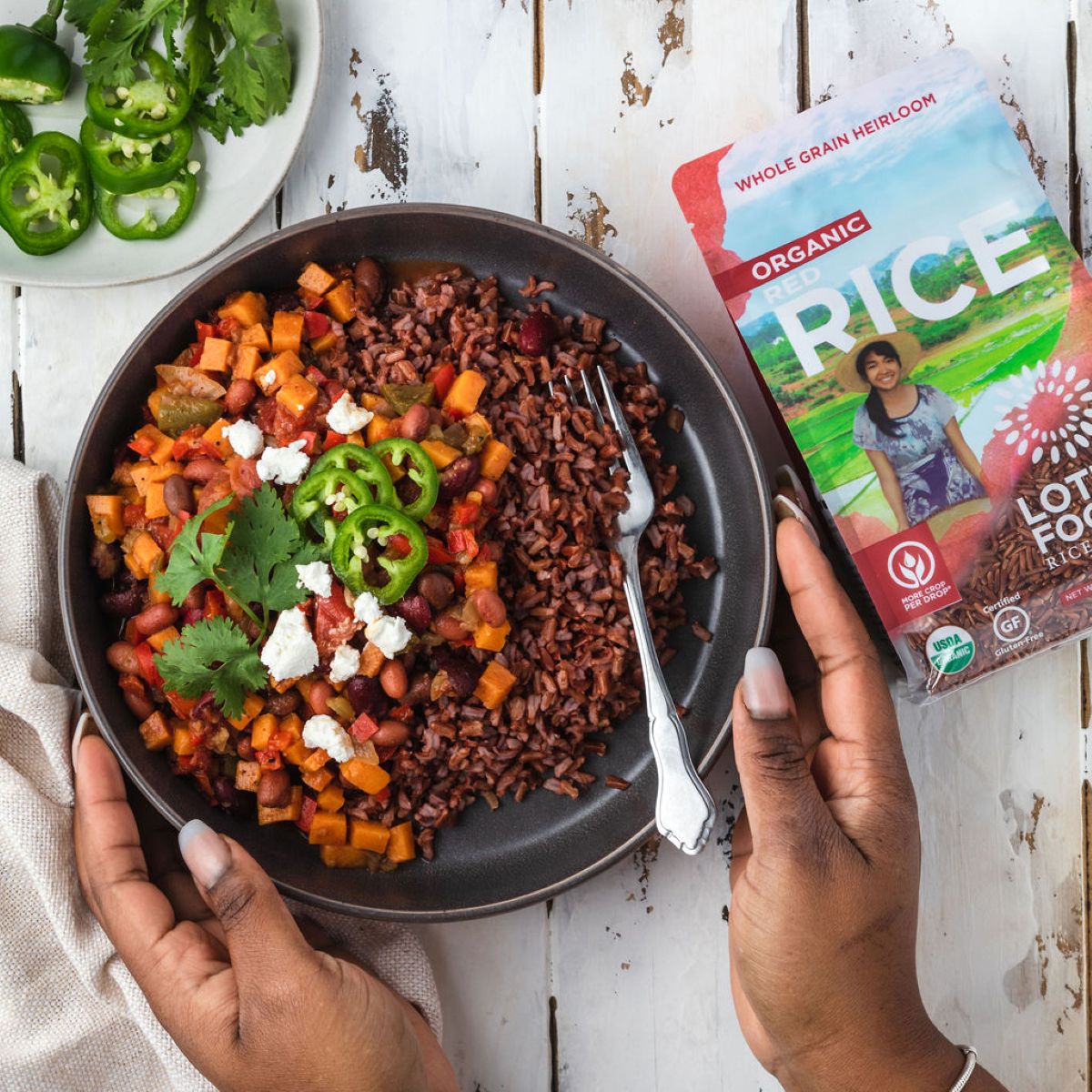 Grown on family farms in Thailand, this long grain rice retains its entire bran layer where all of the grain’s nutrients are stored. This whole grain cooks in only 30 minutes, producing a slightly nutty flavor and a toothsome yet tender grain. Red Rice is a natural source of antioxidants called anthocyanins.