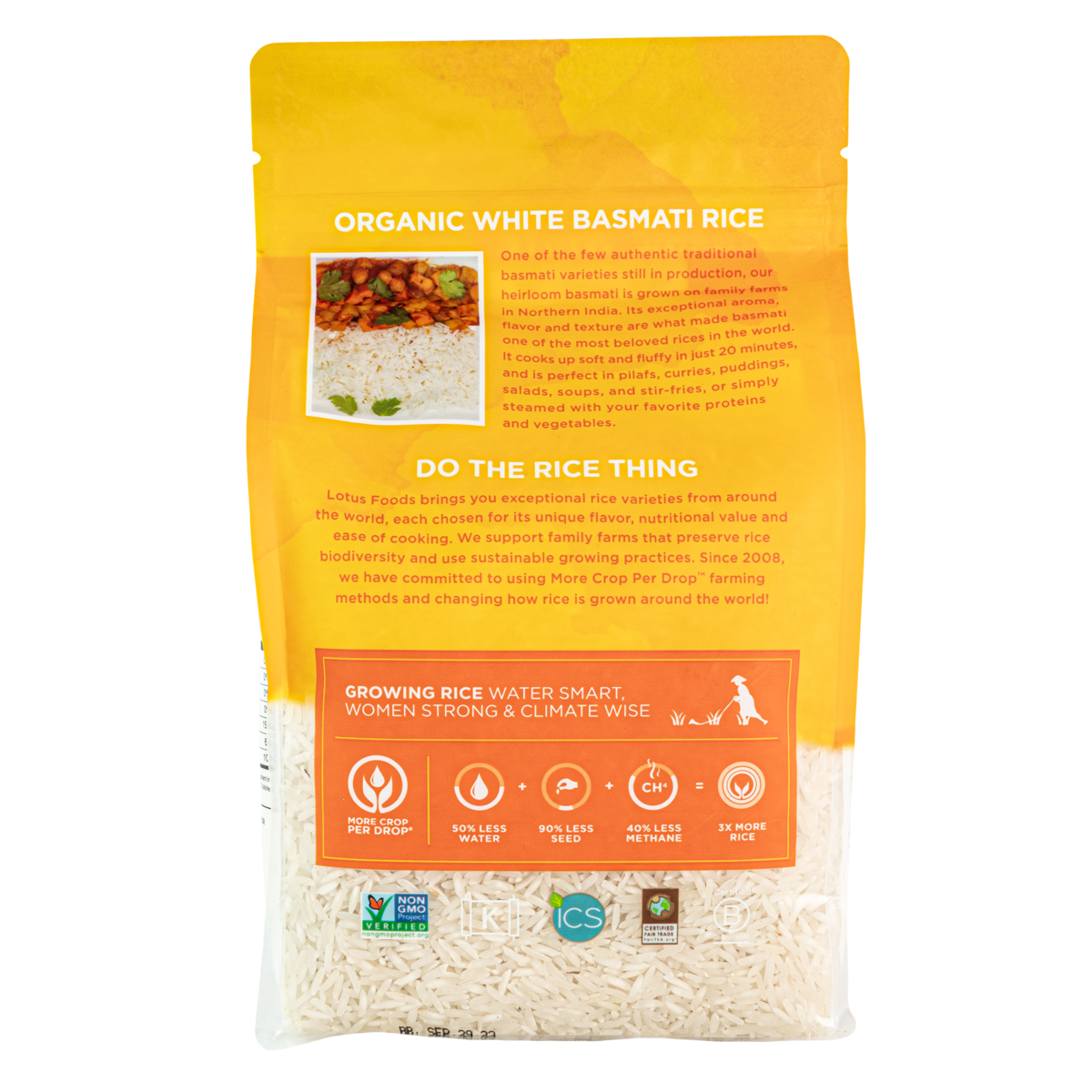 One of the few authentic traditional basmati varieties still in production, our heirloom basmati is grown on family farms in Northern India. Its exceptional aroma, flavor and texture are what made basmati one of the most beloved rices in the world. It cooks up soft and fluffy in just 20 minutes, and is perfect in pilafs, curries, salads, stir-fries, and more.
