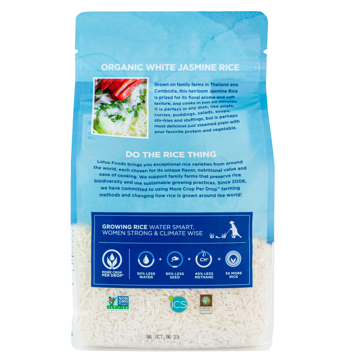 Elevate your meals with Lotus Foods Organic White Jasmine Rice—grown on small family farms in Thailand. This premium, long-grain rice, called Phka Malis (meaning "beautiful garland of flowers" in Khmer), has a naturally fragrant, floral aroma that makes every dish feel special.