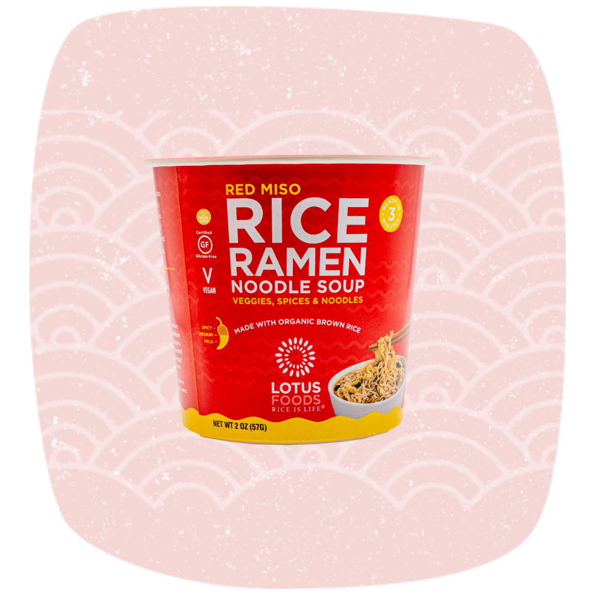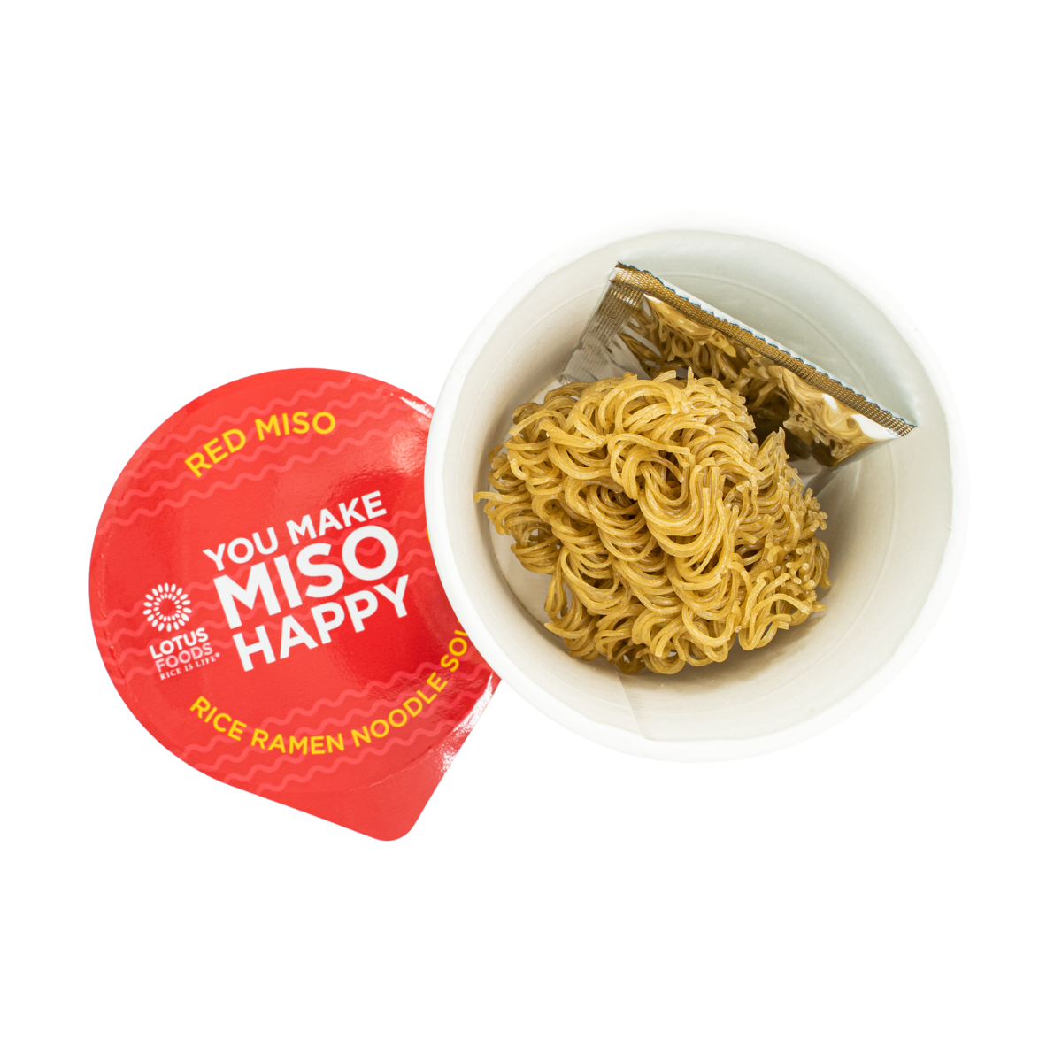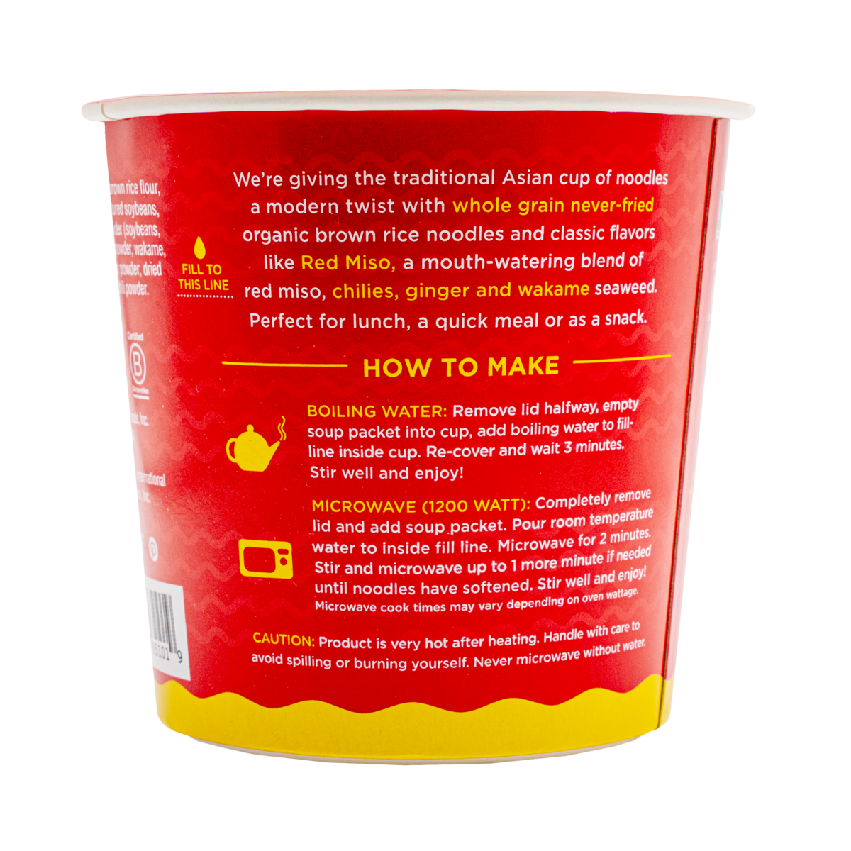 Red Miso Rice Ramen Noodle Soup Cup is a mouth-watering blend of red miso, chilies, ginger and wakame seaweed with medium heat. Our delicious ramen soup cups are a modern twist on the traditional Asian cup of noodles, but with whole grain never-fried organic brown rice noodles.