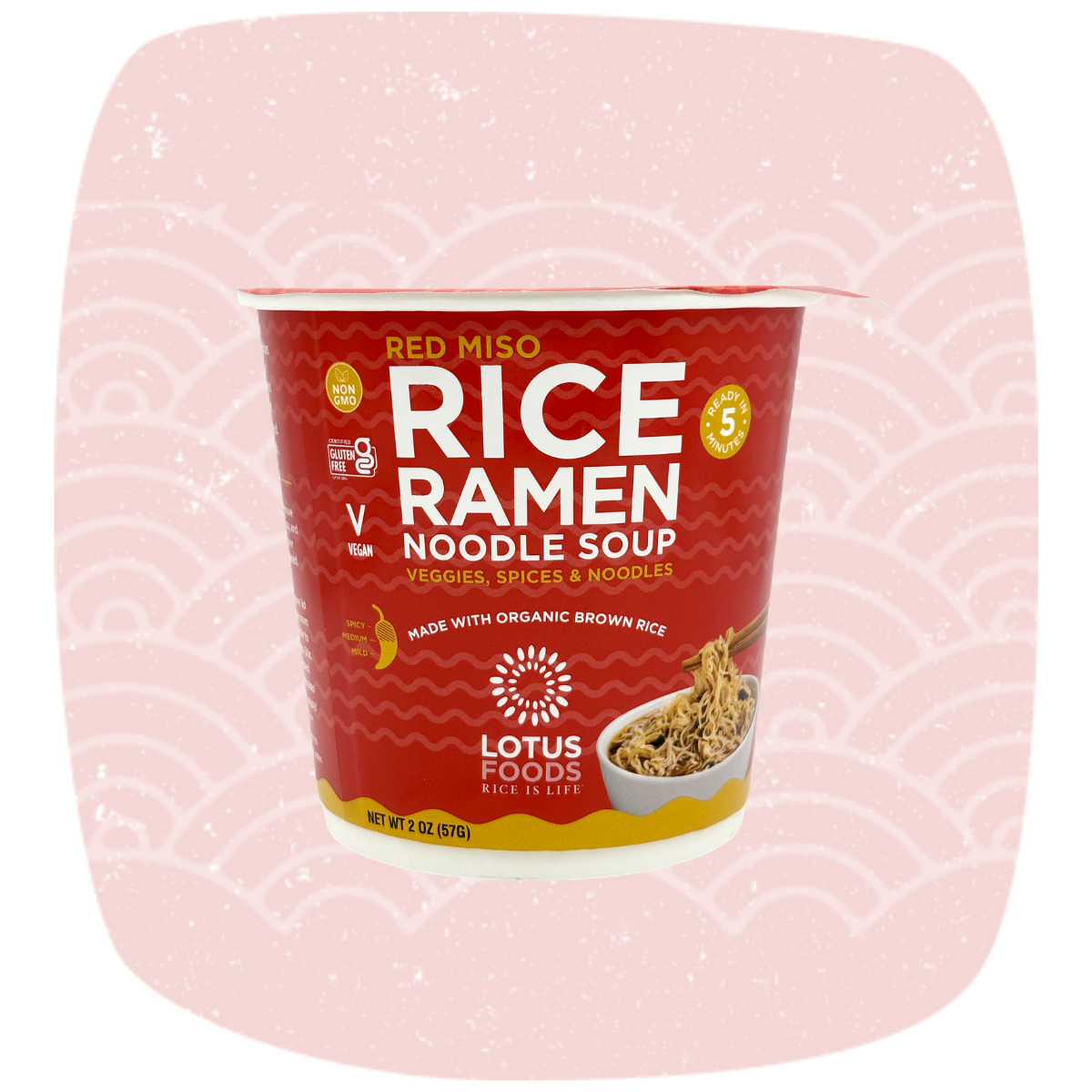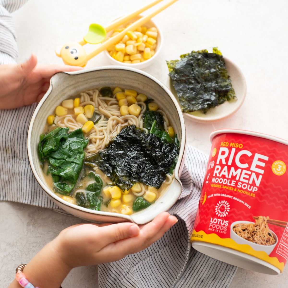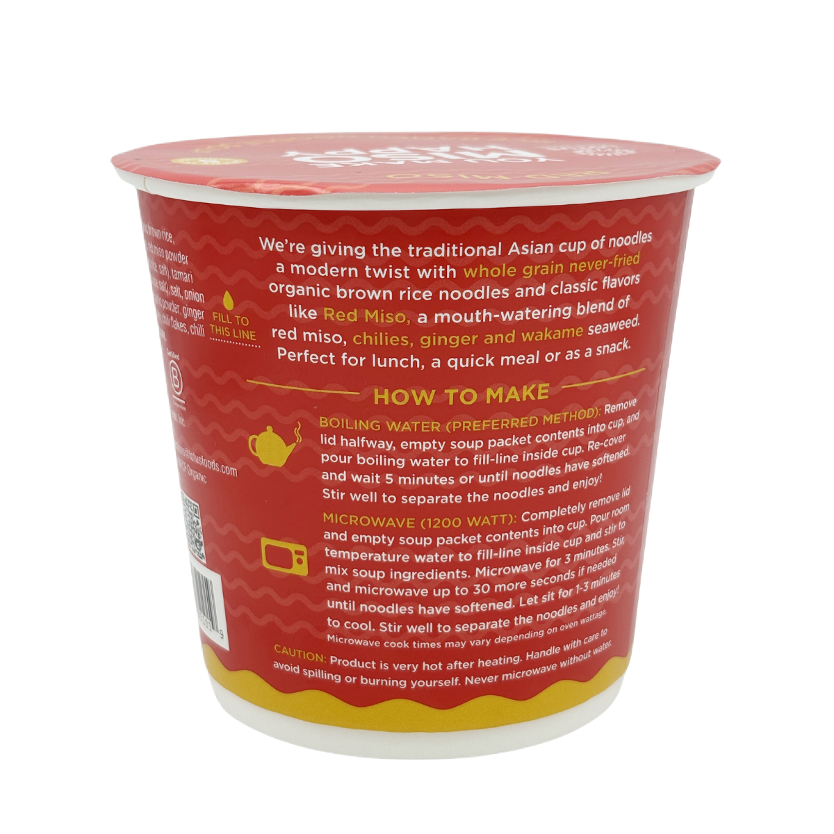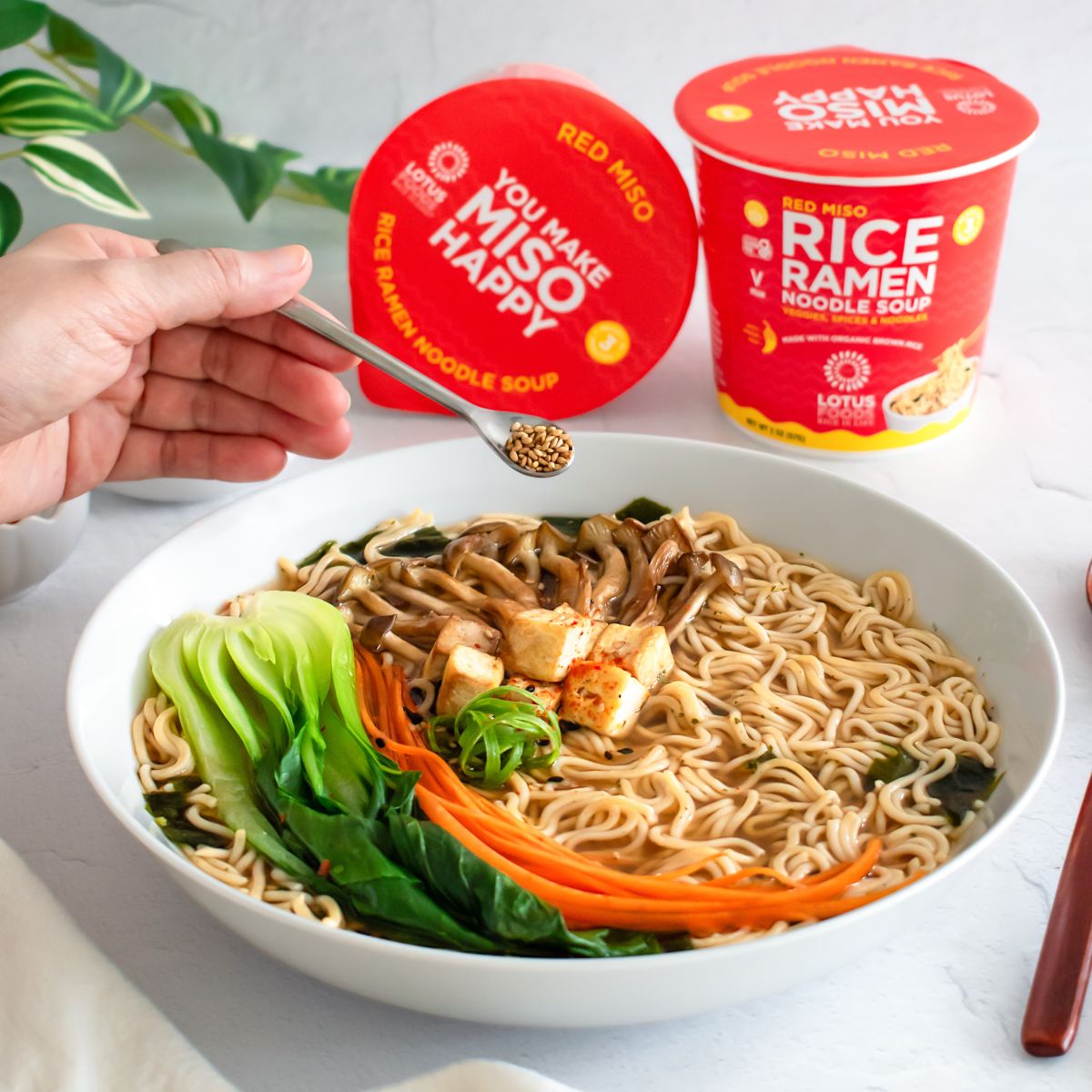 Red Miso Rice Ramen Noodle Soup Cup is a mouth-watering blend of red miso, chilies, ginger and wakame seaweed with medium heat. Our delicious ramen soup cups are a modern twist on the traditional Asian cup of noodles, but with whole grain never-fried organic brown rice noodles.