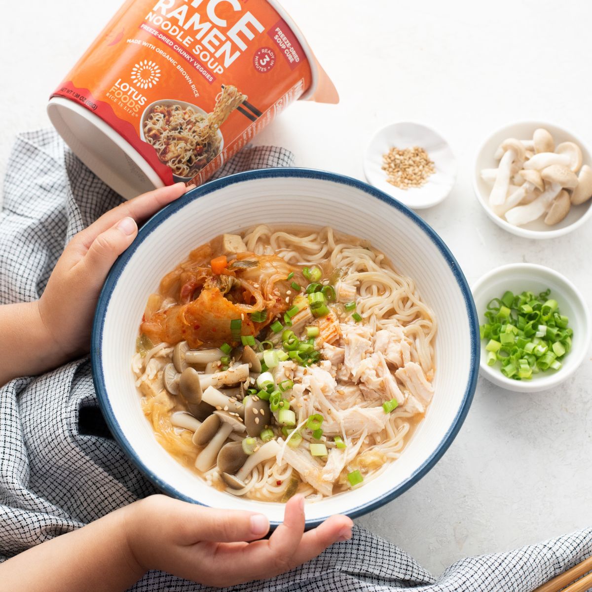 Spicy Kimchi Rice Ramen Noodle Soup with Freeze-Dried Chunky Veggies